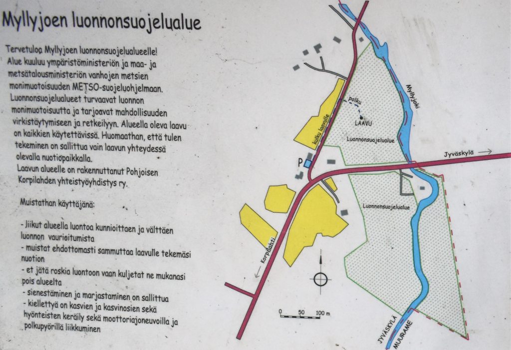 Myllyjoen luonnonsuojelualue kuuluu vanhojen metsien monimuotoisuuden METSO-suojeluohjelmaan. Alueella sijaitsevan laavun kunnossapidosta vastaa Pohjoisen Korpilahden yhteistyöyhdistys. Laavun parkkipaikka löytyy vanhan koulun pihapiiristä käännyttäessä Saukkolahdentieltä Kuusimäentielle. Parkkipaikalla on myös tarkemmat opasteet muutaman sadan metrin päässä sijaitsevalle laavulle.